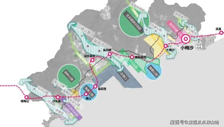 全季活力沙滩海域——小梅沙海滨公园,“鹦鹉螺”造型的小梅沙海洋世界,由钓鱼台美高梅酒店集团统筹运营的钓鱼台精品酒店、深圳美高梅酒店、深圳美高梅麦思精选酒店国际星级酒店群,承载艺展文化服务功能的梅沙客厅,高端滨海住宅产品小梅沙·觐海府,企业会所、企业公馆、办公组成的多元商务办公空间,“潮生活”文旅商业综合体滨海主题商业,叠翠湖郊野公园,交通集散中心等。