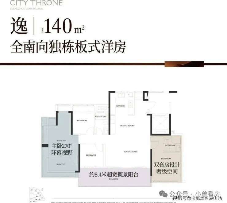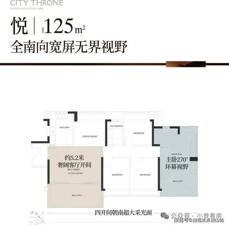 其三,270°飘窗+约8.4米南向巨幕阳台+双南向套房,户型很惊艳这个户型,四开间朝南,也是改善客户的首选。