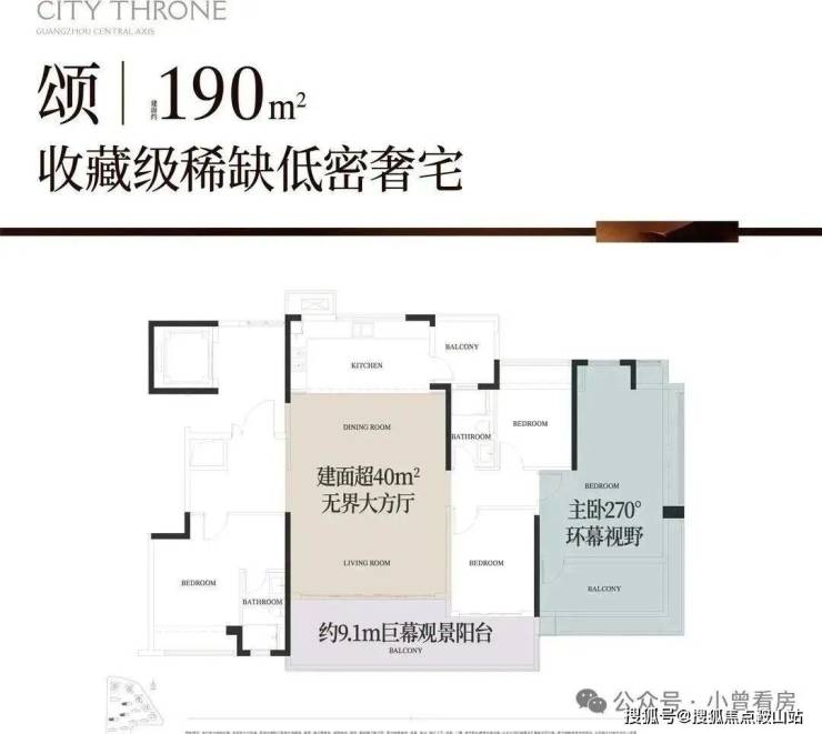 位于西边户的户型,三面景观,西面白云山景观,南向广州中轴+园林景观,北向白云山+园景;再加上约21米270°云山观景面,视觉享受拉满了。