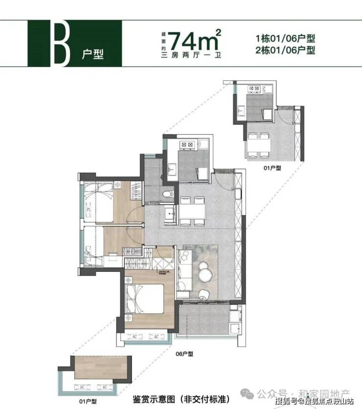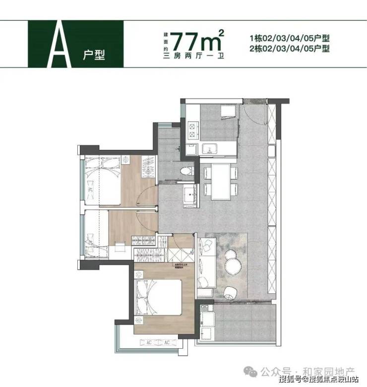 建面约74-77㎡纯粹三房住宅