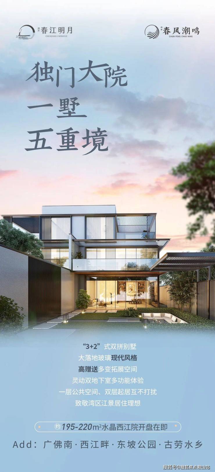 鸿升春江明月由两大产品系组成,东坡的合院,产权面积约175-256㎡中式古典合院;西江的洋房,建筑面积约83-105㎡墅区江景洋房。项目将打造成为古劳水乡旅游区不可多得的低密度高尚住宅。