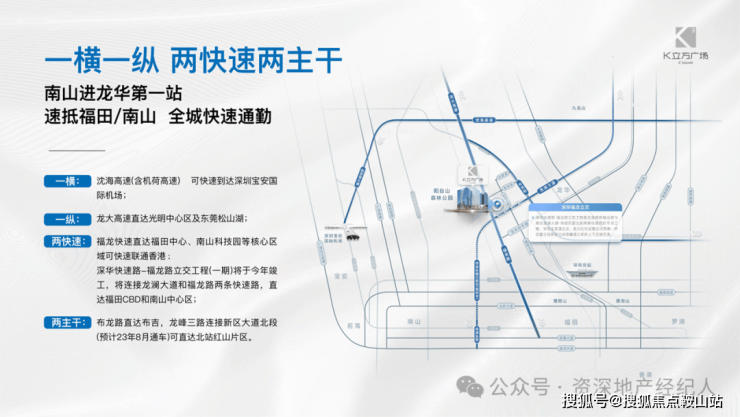 ·2快速:福龙快速直达福田车公庙,可快速联通香港。深华快速路-福龙路立交工程(一期)将于今年竣工,连接龙澜大道和福龙路两条快速路,未来侨城东路北延线开通后,一站直达南山中心区