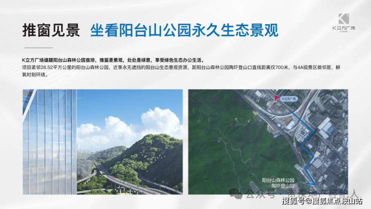 紧邻约28.52平方公里的阳台山森林公园,近享永无遮挡的阳台山生态景观资源,距阳台山森林公园绿道入口直线距离仅约700米,门口配套4A级景区。推窗是景观,处处是绿意,自由呼吸鲜氧,享受绿色生态办公生活!