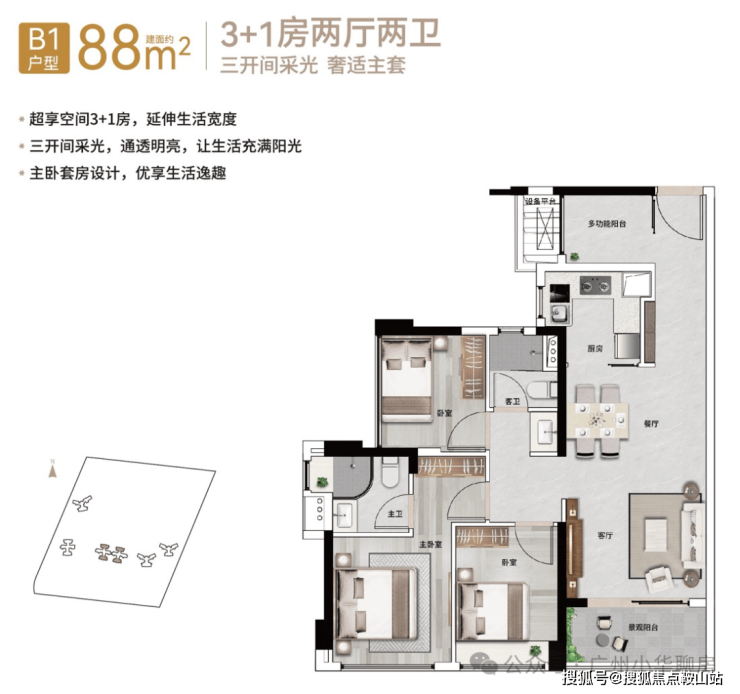 ❗88㎡3+1房2厅2卫(横厅)❗💎同等面积多一房,稀缺小户型💎低总价晋阶天河———————————————【88㎡3+1房2厅2卫(带主套)阔绰横厅格局,南北通透稀缺小户型,低总价晋阶天河(此价格未能实时更新,以现场实际可售房源价格为准)