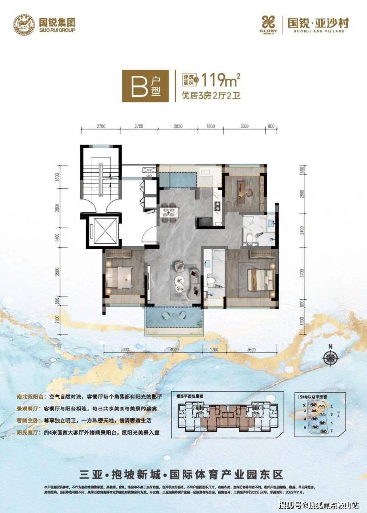 B 户型 119㎡优居 3 房两厅两卫,南北双阳台促进空气对流,景观餐厅与阳台相连,奢阔主卧配备独立明卫,阳光宽厅外接阔景阳台;