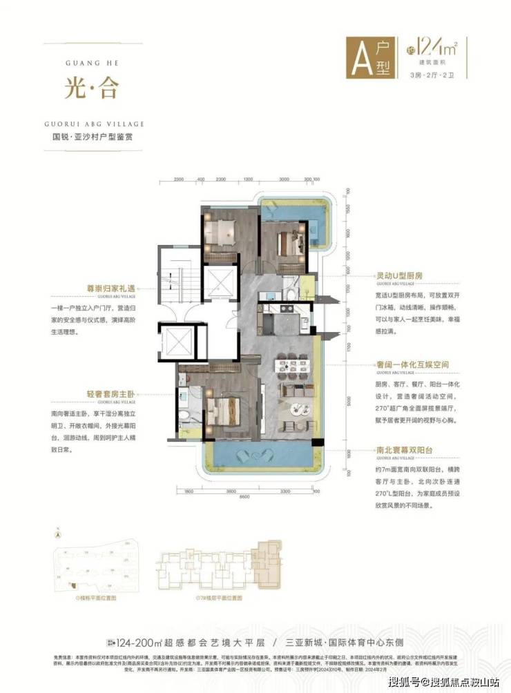 在户型设计上,国锐・亚沙村推出了多种户型,面积从 101 - 200㎡不等,包括 2 + 1 房至 3 + 1 房等多种布局。A 户型 101㎡的美居 2 + 1 房两厅两卫,设有约 10㎡灵动空间,南向阳台开阔,主卧套房独立明卫,餐厨一体;