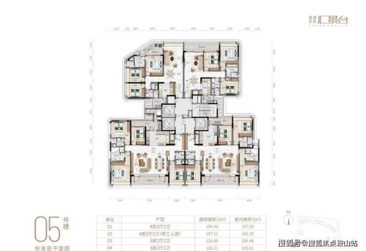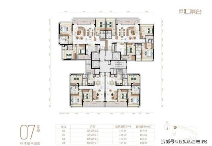 项目由14栋12层小高层组成,产品涵盖123-352㎡三至五房,共8类户型,户型实用率约82-84%
