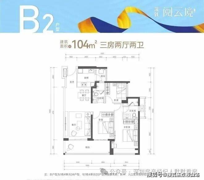 104㎡的3房2厅2卫,B2-1栋4单元03.04户型,设计的是经典竖厅格局,进门入户玄关,客厅3.5米开间,LDKB一体化,S墙设计预留冰箱卡槽位,三开间朝南,动静分区,3个卧室分别做到了主卧16.1㎡/次卧9.12/次卧6.89㎡(包含墙体飘窗),二字型厨房带1个2.43㎡大的生活阳台,卫生间干湿分离,得房率79.2%(不含赠送),客厅连接次卧出11.43㎡大阳台,正南朝向。套内面积82.37㎡+赠送面积10.14㎡=实际使用面积92.51㎡,加上赠送后得房率约88.95%。