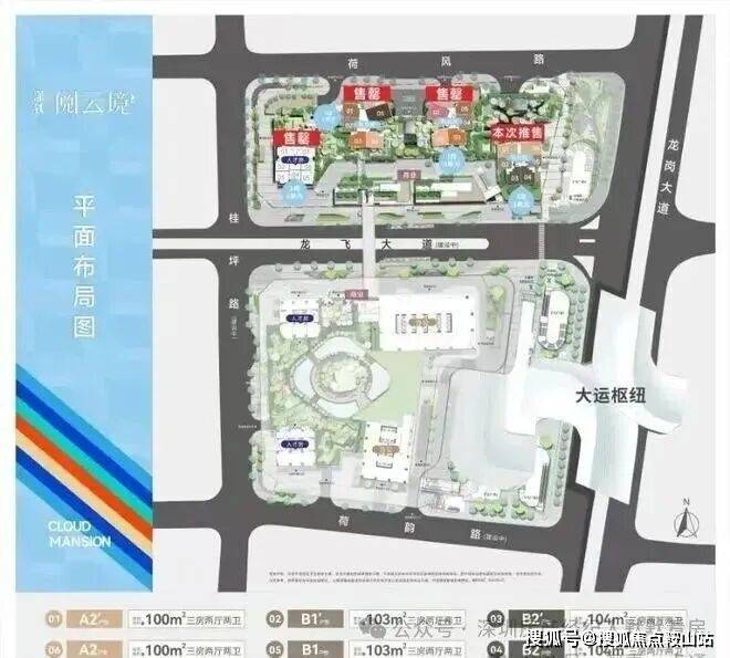 深铁阅云境广场,作为大运交通枢纽上盖物业,总占地面积约5.66万㎡,总建筑面积约51万㎡,以龙飞大道为界共分南北2期开发,有空中连廊相连,北区建设住宅小区,南区兼顾了公共性和便捷性,主要规划超高层办公写字楼和大型商业mall。