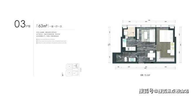 B户型:约164㎡2房2厅2卫:B栋15-26F(中区)端头户型,东朝向