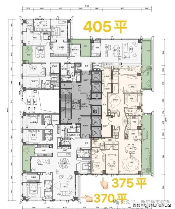 · 370-375㎡户型: 4+1房五卫设计,配备家庭厅和家政套间,适合有多样化生活需求的高净值家庭。