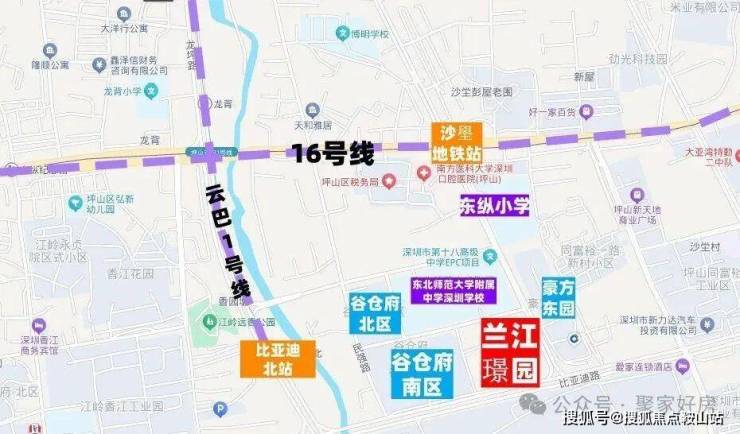 兰江璟园,位于坪山区石井街道比亚迪路豪方东园西侧,项目南侧是坪山比亚迪厂区,还有比亚迪六角大楼,西侧是方直谷仓府,北侧紧挨着东北师范大学附属中学深圳学校,16号地铁线“沙壆站”距离约400米。