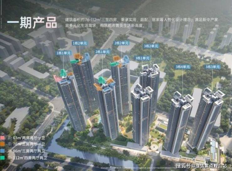 8栋共计2394户,户型为63㎡2房1卫、76㎡3房1卫、86㎡3房2卫、113㎡4房2卫。
