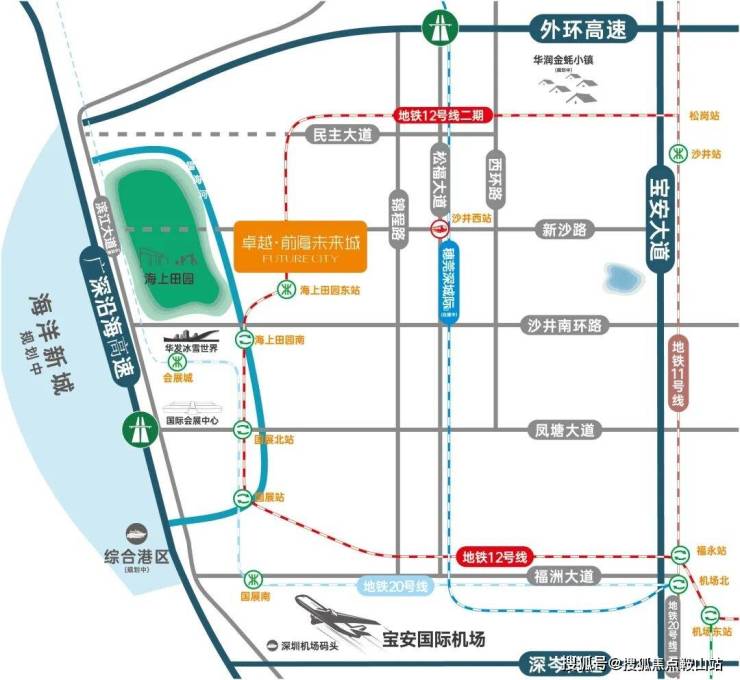 紧邻地铁12号线海上田园东站,2站到达国展北站换乘20号线(10分钟可达机场T1/T2航站楼),6站到达福永站换乘11号线。