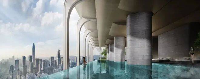 项目在150米高空打造的横跨3栋楼的云端会客厅,正面饱览银湖山、笔架山的绿意葱茏,景观无敌。这个会客厅面积约6000㎡,由云端会所+休闲绿化平台组成,其中云端会所设有私人宴会厅、山景健身中心、无边恒温游泳池、瑜伽房等场所,引入的都是高端品牌,提供的都是星级酒店会所服务