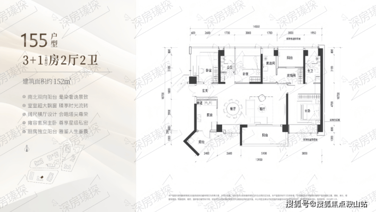 152㎡的4房2厅2卫,3栋2单元01户型,设计的是横厅南北通透格局,进门入户玄关,客餐厅7.7米开间,LDKB一体化设计,四开间朝南,4个卧室分别做到了主卧21.17㎡/次卧12.4㎡/次卧11.7㎡/次卧11.7㎡(包含墙体飘窗),客厅出5.1米长阳台,L型厨房带1个生活阳台,公卫三段式分离,得房率约90%(包含赠送),东南朝向。