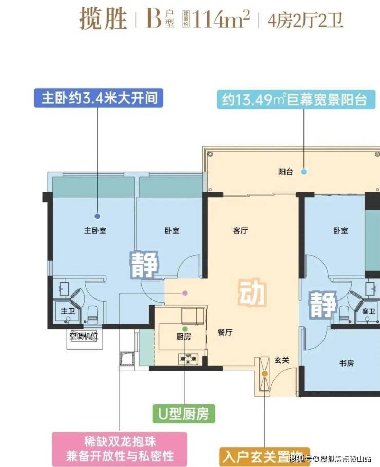 114㎡双龙抱珠4房2厅2卫,34套,490-520万,单价约4.45万/㎡