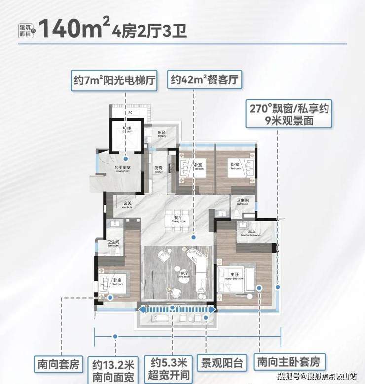 建面190平四房三卫,四开间朝南,超大玄关专梯入户,9.4米观景阳台,客厅与次卧打通的话,客厅开间也可达9.4米,超43平的主卧,270度环幕飘窗。