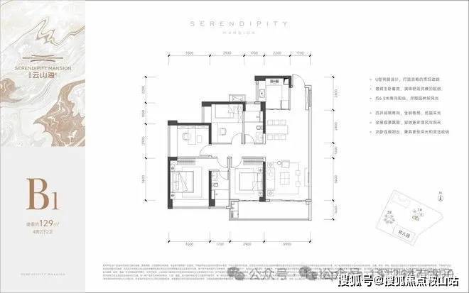 129㎡的4房2厅2卫,分布在1栋的03.04户型,设计的是竖厅格局,客厅3.9米开间,客厅连接次卧出大阳台(6.8米长),三开间朝南,卧室宽度分别为3.5/2.9/2.9/2.9米,U型厨房,卫生间干湿分离,都是西南朝向。