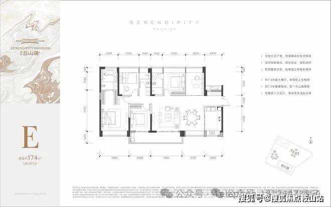 174㎡的5房2厅3卫,分布在1栋的01.02户型,设计的是横厅格局,客餐厅一体化7.4米开间,客厅连接次卧出大阳台(7.3米长),三开间朝南,全屋飘窗,双套房设计,卧室宽度分别为4/3.2/3/2.9/2.6米,U型厨房,公卫三段式分离,阳台主朝西南向。