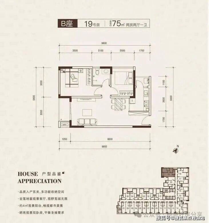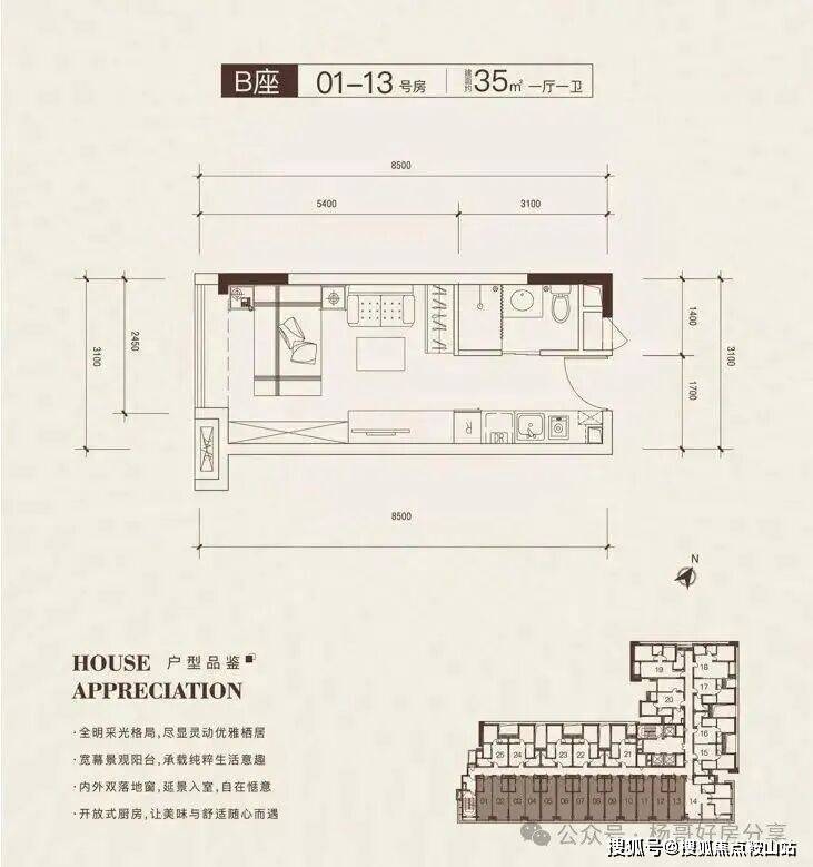 其中,公寓可售单元217套,主推建面约35-98㎡1-3房商务公寓,户户带阳台,采光通风性能佳。