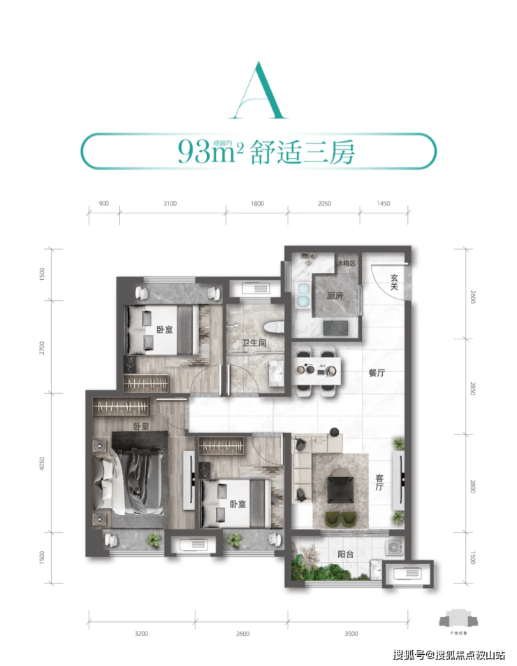 A户型:约93㎡ | 3房1卫 | 均价12800元/㎡
