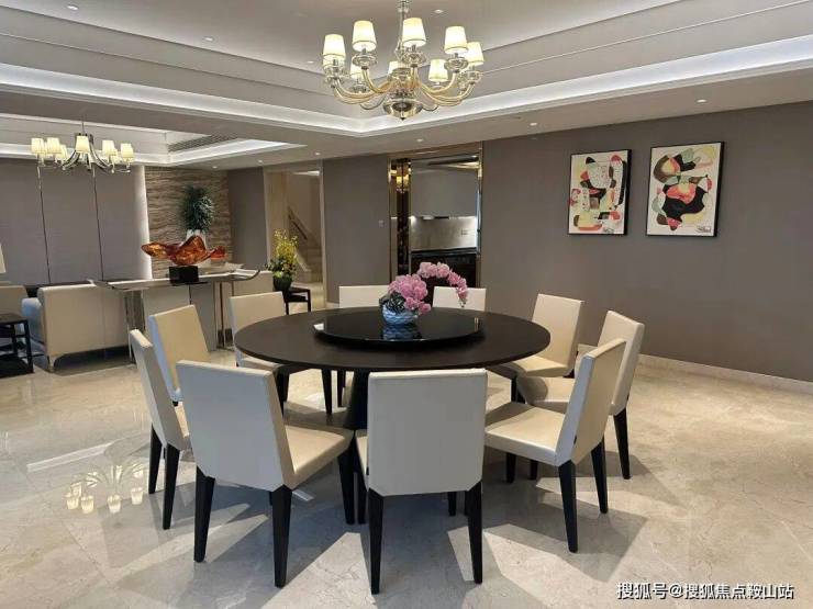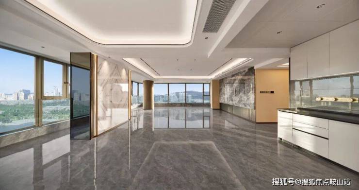 当熹微的晨光、夕照的落阳、浮光的流萤穿透约26米环幕落地窗,映照奢石铺成的背景墙,光影交织里不声不响地演绎出高贵的精致,意式的理性与克制以一种生长的精神为未来生活提供无限可能。而层次感丰富的吊顶设计,搭配高级灰色纹理地面与镶嵌的奢石,形成了一种不显山露水却又奢华自如的质感。