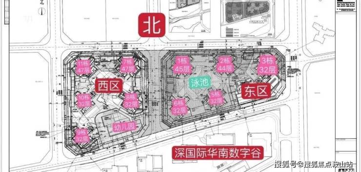 西区:占地2.2万㎡,容积率5.16,包含住宅、商业、幼儿园学校和其它基础配套设施。7栋栋总高47F,3T6户;8栋、9栋、10栋总高32F,2T5户;11栋总高46F,3T6户,2T5户;1栋是幼儿园。