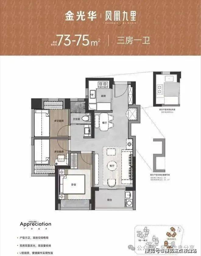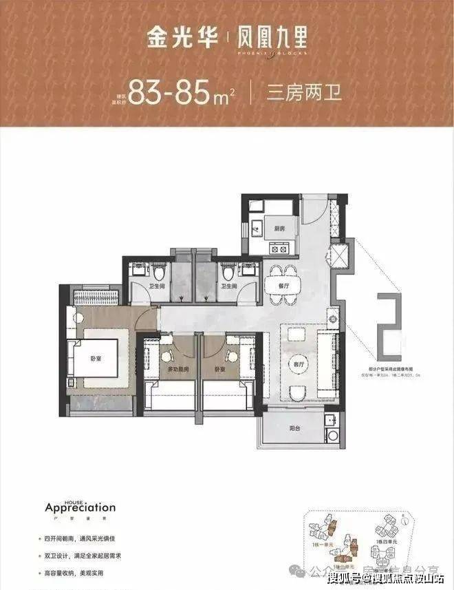 85㎡的3房2厅2卫(01.07户型),设计的是竖厅南北通透格局,主卧双飘窗设计,U型厨房,客厅阳台主朝西北、东北向。