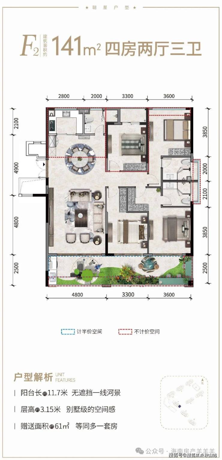 ②产权式酒店,户型南北通透,面积93-145㎡两房至四房。赠送超大面积,93㎡两房一卫、97㎡小三房两卫、115㎡三房两卫、141㎡四房三卫;阳台面宽高达12米,部分阳台可270°三面河景。