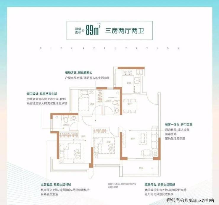 89㎡的3房2厅2卫:有2个户型,1个设计的经典竖厅格局,有西南及东南朝向;1个设计的竖厅南北通透格局,U型厨房。