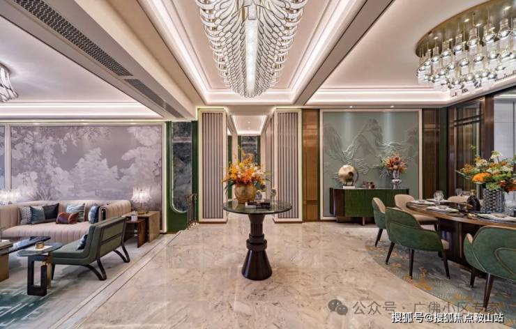 ✨过厅背景墙采用绿翡翠岩板搭配驼色BV纹皮革;