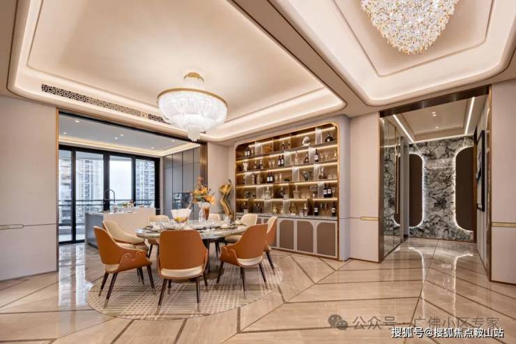 ✨餐厅背景墙采用镶嵌白雪冰玉大理石的扪皮装饰收纳柜,美观实用。