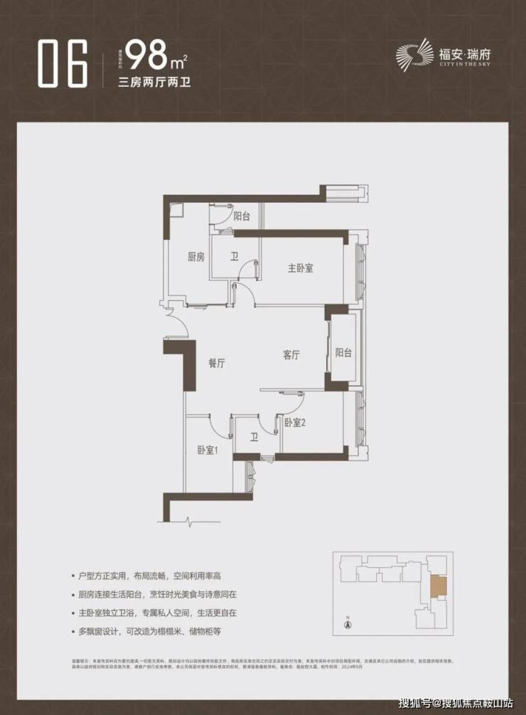 主推建面约97-98-112-126-143㎡的3-4房产品,户型均设计有双阳台、双套房。
