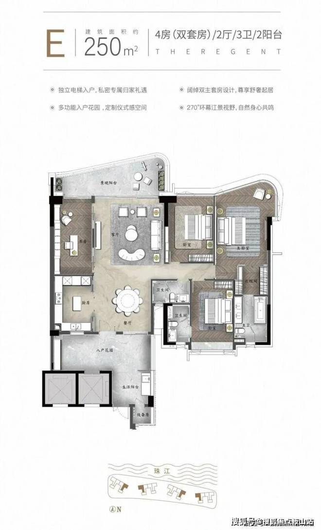 项目总占地800亩(约53万㎡),仅为千户所有,容积率约1的低密奢阔墅区。拥有三江汇聚的甄稀景观,是全城难得享受双向江景的豪宅,饱览城市中央独特的江畔景致。