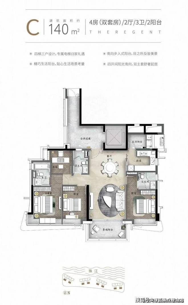 生态资源:一线临江,坐拥2公里珠江景观带,南向无遮挡视野,江景房占比超80%。