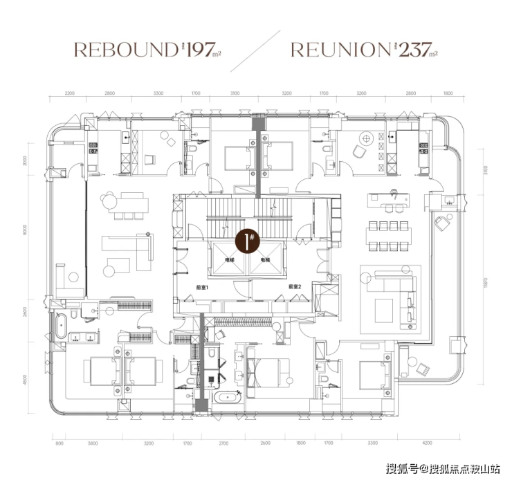 197㎡四+1房三卫户型阳台达8米采用板式结构,南北通透,专梯入户 通风和视野条件优越。双套房,主卧套房配备独立衣帽间和卫生间