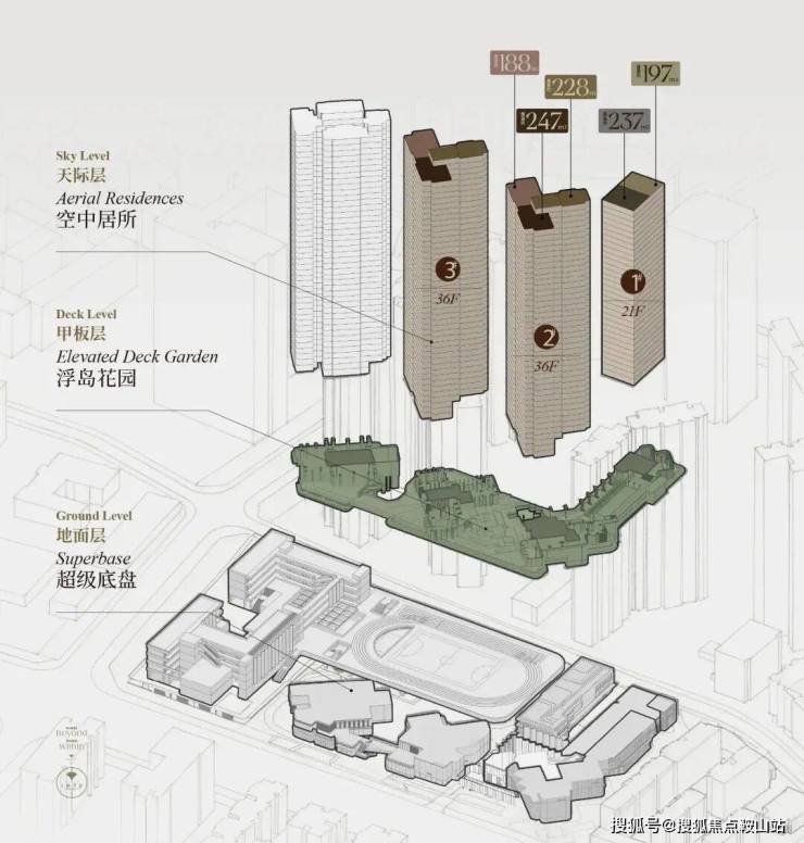 这次「后海招商玺」住宅设计采用“浮岛甲板”设计策略,四栋住宅落于甲板之上,独享甲板庭院花园。进而形成超级社区底盘 + 浮岛绿化甲板的垂直共生人居标杆。