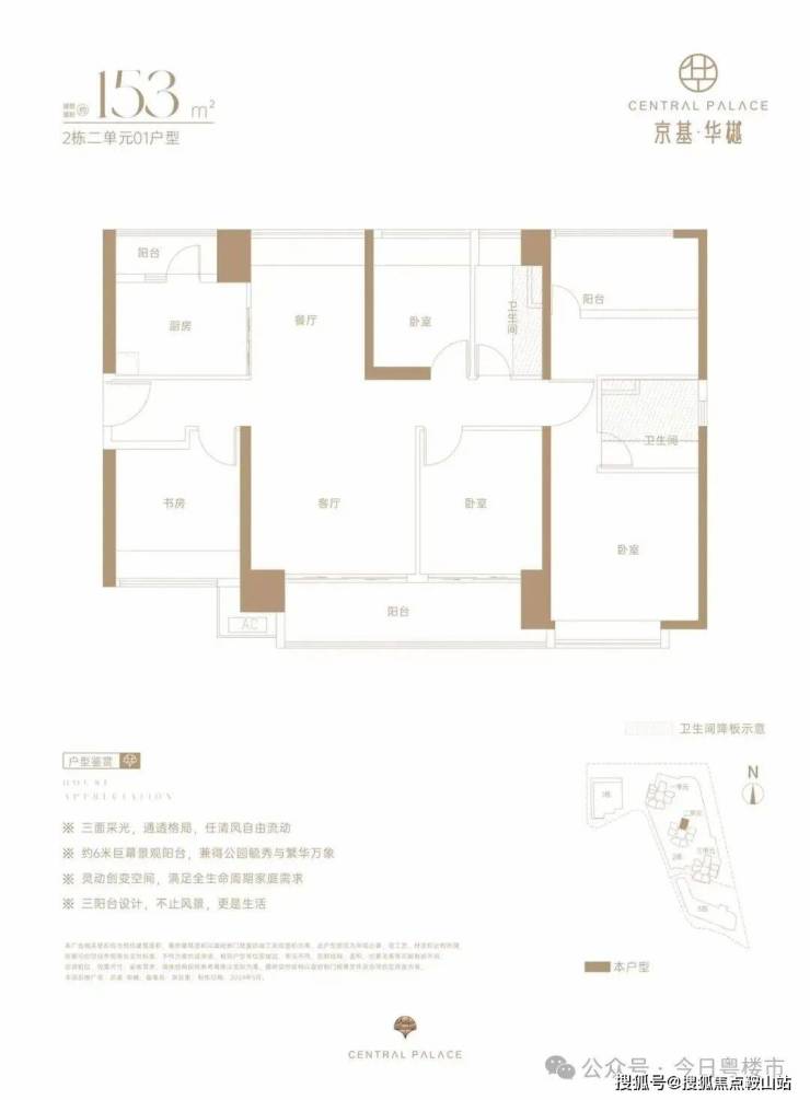 仅2栋2单元05户型才有,设计的是经典竖厅格局,LDKB一体化,动静分区,四开间朝南,U型厨房,卫生间干湿分离,得房率约73%(不含赠送),阳台西南朝向。
