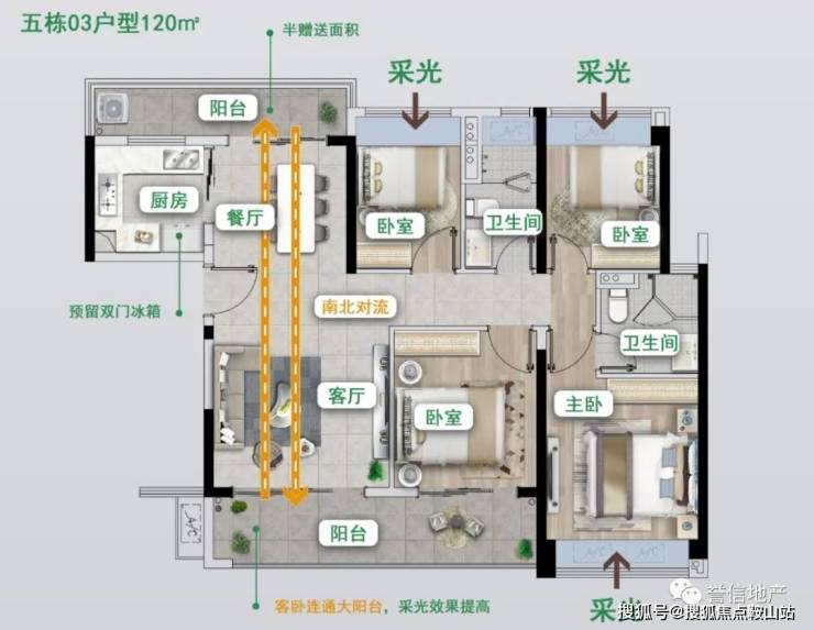 四室两厅两卫奢居—120㎡,7米朝南主阳台,双阳台布局南北对流。