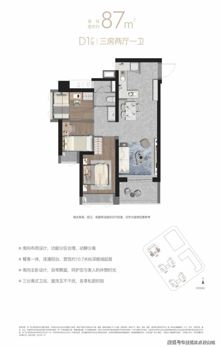 “10.7 m纵深紧凑南向三房”,10.7 m纵深餐客一体,通风采光极佳