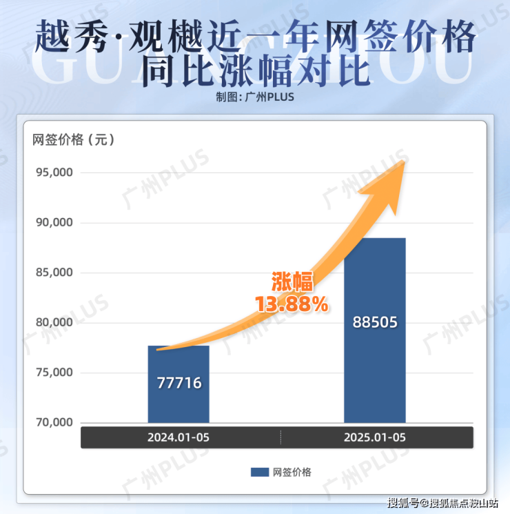 到了 2025 年同期,观樾均价飙升至 8.8 万 /㎡,涨幅达 13.88%,而片区均价仅微涨 2.3%。