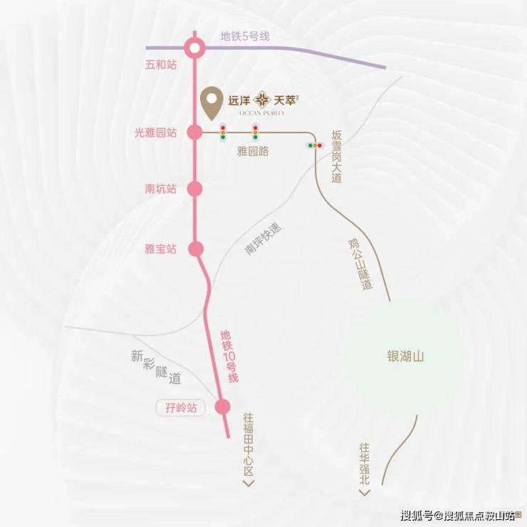 项目由远洋集团打造,位于坂田街道五和大道与光雅园路交汇处东北侧,紧邻地铁10号线光雅园站B出口。总占地面积约1.36万㎡,共由4栋总高44-47层的住宅+1栋34层的办公组成:其中,1栋1、2单元为47层住宅,5单元为45层住宅,约615套住宅(含50套回迁房);1栋4单元为41层人才房,共180套人才房;1栋3单元为34层写字楼;2栋规划为3层幼儿园。