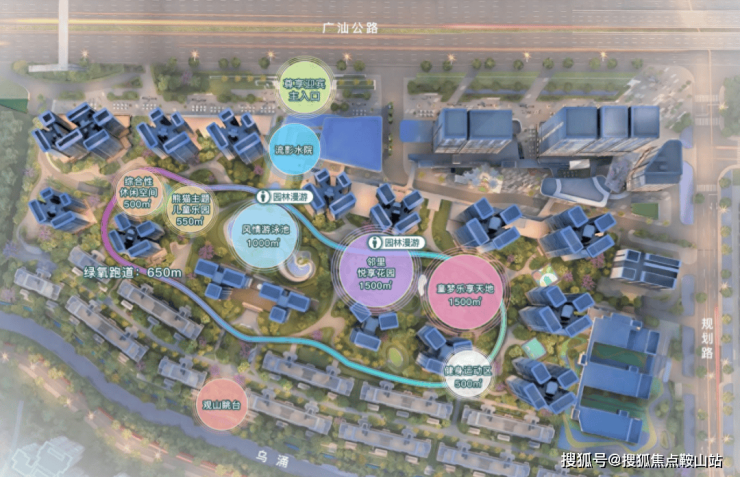 小区的空间布局遵循“一纵一环九节点”,整体为现代化简约风格,结合周边珍贵自然资源,设计理念融合山色与流水概念,创造以“流动 的森林”为主题的园林。