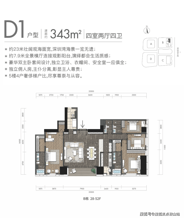 D1户型:约343㎡4房2厅4卫:B栋28-52F(高区),东朝向