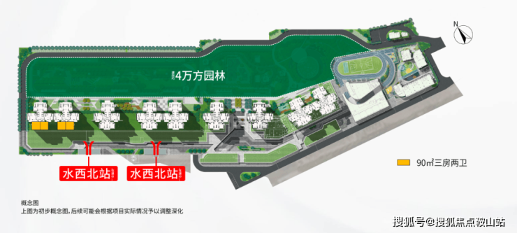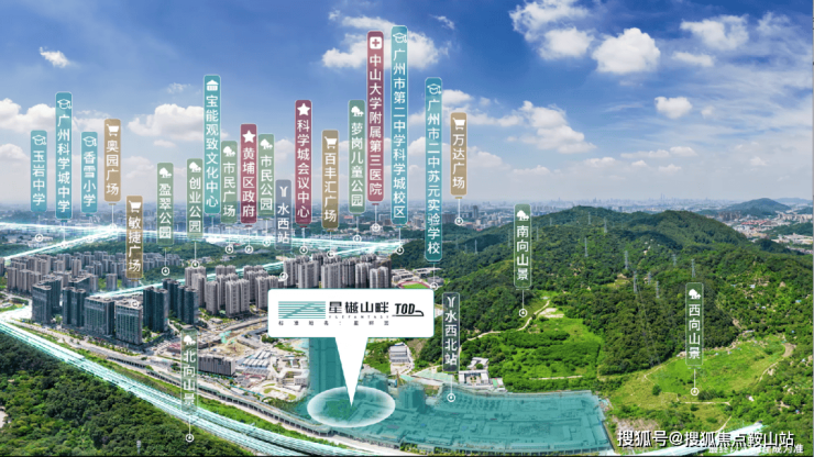 星樾山畔 TOD 位于广州市科学城 7 号线燕山地铁上盖,占地面积 87000㎡,建筑面积 338000㎡,容积率 2.75,绿化率 32%,总栋数 9 栋,总户数 2156 户,在售面积为 80~110㎡。