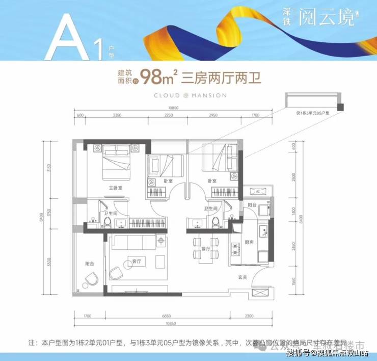 约98㎡的3房2厅2卫(A1户型,1栋2单元01户型/1栋3单元05户型),竖厅设计,进门独立玄关,客厅3.5米开间,LDKB一体化设计,动静分区,3个卧室分别做到了主卧15.9㎡/次卧9.29㎡/次卧7.08㎡(包含墙体飘窗),二字型厨房还带1个生活阳台。