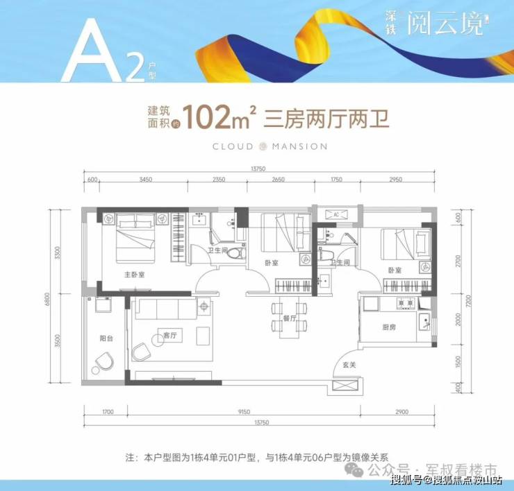 约102㎡的3房2厅2卫(A2户型,1栋4单元01.06户型),竖厅设计,进门独立玄关,客厅3.5米开间,LDKB一体化设计,3个卧室分别做到了主卧14㎡/次卧9.73㎡/次卧8.74㎡(包含墙体飘窗),L型厨房,公卫三段式分离。
