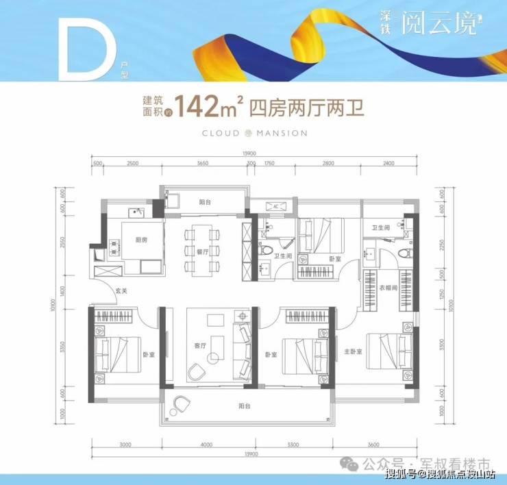 约142㎡的4房2厅2卫(D户型,1栋2单元05户型)设计的是竖厅南北通透格局,客厅4米开间,四开间朝南,双阳台设计,4个卧室分别做到了主卧18.24㎡/次卧11.85㎡/次卧10.89㎡/次卧9.38㎡包含墙体飘窗),主卧大套房设计,客厅连接次卧出7.3米长的大阳台,U型厨房,大阳台主朝东南向。