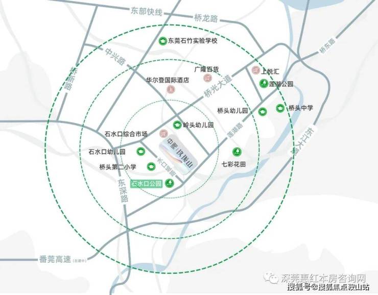 ◎三轨道:桥头坐拥R3、R17、惠州5号线延长线(规划中),三轨交融,串联东莞三大核心发展极,纵横莞惠两地,其中项目距离R3线大东路(规划)仅3公里。
